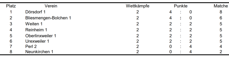 | 2. | Oberlinxweiler | 10 : 02 Punkte bei 21 Match-Punkten |